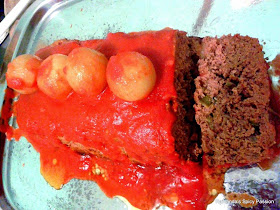 6. When the loaf is done, drain all the excess fat and carefully invert upside down on a serving plate, top with the tomato sauce and onions. Serve hot!!