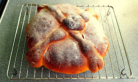 The particular loaf's shape comes from two finger shaped put across the loaf which represent bones. Traditionally it is served with atoles which are hot drinks flavoured with a myriad of flavours usually these include cocoa,sugar, vanilla, and honey. These atoles are thickened with corn dough which is dissolved in water. One of the most famous atoles is Champurrado which is Mexican style hot chocolate. Delicious!